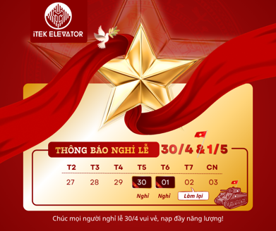 Thang máy iTEK xin trân trọng cảm ơn Quý khách hàng đã luôn tin tưởng và đồng hành cùng chúng tôi trong suốt thời gian qua. Để thuận tiện cho việc giao dịch và liên hệ công việc, iTEK xin thông báo lịch nghỉ lễ như sau: